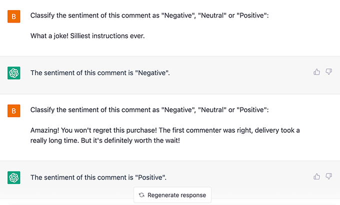 This is where you can use OpenAI’s emotional intelligence. It can perform sentiment analysis by identifying the mood of your customer’s feedback as negative, neutral, or positive.