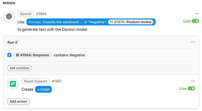 You can start to unlock the real power of AI by combining it with automation. With Uncanny Automator, you can use a negative response as a trigger for any action you like, such as notifying your marketing team or creating a ticket in your help desk software. You can even have OpenAI automatically draft a reply.